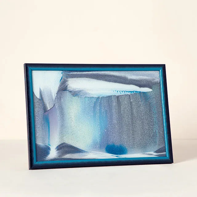 This calming sand window features multicolored sand and water sealed between glass panels within a wooden frame, creating ever-changing landscapes as the piece is rotated. Designed as a soothing visual accent for home or office, the flowing sand forms clouds, mountains, and abstract patterns that shift with each turn. Materials: plastic, glass, sand, wood, and water. Size: 11.5" H × 16.5" W. Care: do not place in direct sunlight and rotate the frame at least once per month. Natural variations in sand flow and patterns are expected and part of the design.